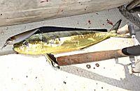 今日もシイラ、潮目を流して1本(俺じゃないけど)その後は一昨日のポイントを前と同じパターンで攻め続けたが、遊魚船が入れ替わり立ち変わり入って来るので、その度に活性がどんどん下がって行く。ボートが与えるプレッシャーは物凄いね。そんな中船中9GETは立派です。私の1本目はHITと同時に走られてフックアウト、2本目は本日最大のメーター級だったが5分ほどの格闘の末フックが折れてバイバイ。3本目は80程度、船底でラインブレイク、ごめんシイラちゃん。4本目は80ちょいで無事ランディング、5本目80あるかないか。まだ完璧にこれだと言うパターンが分からない、でも絶対に何かあるはず。ある程度は見えているのだがあと一歩が足りない。なぜ食う時と食わない時があるのか、その辺をもっと深く掘り下げて行ってみたいと思っている。これで3/300匹達成。帰りにナブラを発見、さばだけかと思ったがワカシをGET。ちょっとうれしかったぞ。 ![]() |