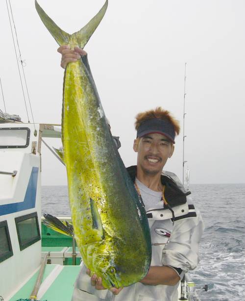 今シーズンのシイラももうすぐ終わりだ、最後にもう一度と相模湾を目指す。 天気を除いて状況は決して良くないのは分かっている。 西に走り二ノ宮沖まで来たところで何とか魚は見つけたがルアーを追いもしない。 このまま初島方面のカツオ船団近くまで行くと大きな流木。すでに4隻の船が集ま り叩いている。カンパチが上がっているとの情報でジグを落として様子を見ると、集 まって来たのはウマズラハギ。 これを何とか釣ろうと遊んでいると、深く沈めていた人に沖サワラがHIT 歯が鋭く数名はラインブレイクされたがGETしたひとが羨ましい、流木一 つにシイラを始め様々な魚が寄っている。カツオやキメジもいるらしいが 残念ながら確認する事は出来なかった。 今度は延々と東に向け拓海ポイント、ここでは100匹以上のシイラが悠然と泳いでいるが なかなかルアーに反応しない。ポツポツとは釣れるがパターンにはめられないのが悔しい 結局ペンペンを2HIT1GET、バスロッドと小さ目のペンシルを持ってくればもう少し楽しめたかも... 状況次第ではもう一度リベンジしたいと思うが、もう秋。 やっぱりカツオかな(笑) |