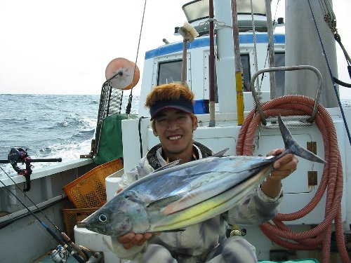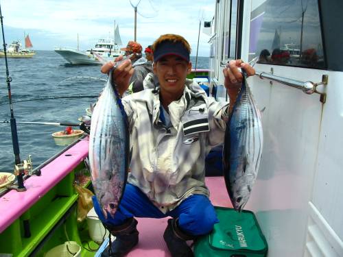 カツオが釣りたい、シイラよりカツオだ! 連日大型が釣れているとの情報で早速相模湾に出撃だ。 カツオ乗合のミヨシでルアーを投げさせてくれと船長さんにお願いして乗船する。 出航前、次々と人が乗って来て、これだけの大型船が超満員。 釣れた後のお祭りを考えるとちょっとへこむぜ。 ![]() 船は一路南を目指し、拓海ポイント周辺まで行ってから鳥山を探し始める。 イワシへボイルしているカツオを見つけてスタート。 メタルジグを遠投しフォーリング中に食ったのは、丸ソーダ。 次の鳥山は無反応。5〜6個鳥山を叩いただろうか、ギャロップ40gでナブラ直撃 ガツンと来た衝撃と共にスナップブレイク、普段使用しているシーバス用のスナップ 強度的には十分なのだが、横方向の衝撃に弱く同じ症状を何度か経験している。 ジグには向かないと分かっていてもついつい(w しばらくすると、無線が入り本ガツオが釣れているとの事、コマセとオキアミで狙う船団に 入り、1分もしないうちにこちらの船でもカツオが釣れ始めた。ジグに反応はなく俺も隠し 持っていた天秤とカゴをオシアジガーにセットして準備完了。